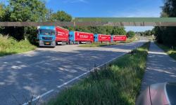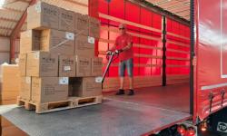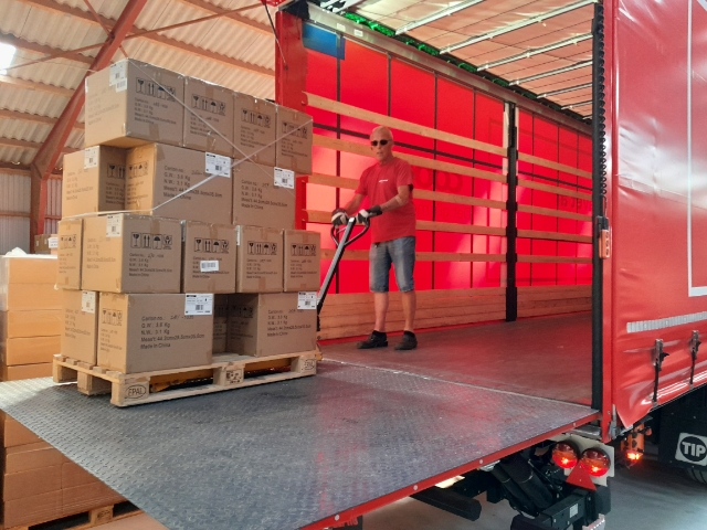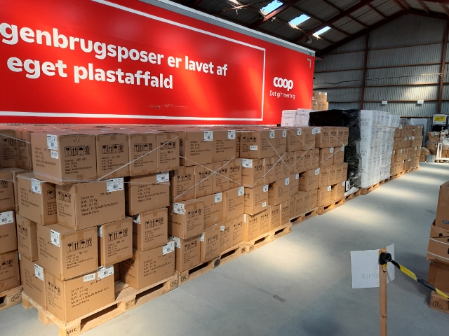 Wednesday 1 September 2021 at 11.30 AM the 263,000 visors - a total of 111 pallets - arrive at Global Medical Aid's warehouse in Skibby, Zealand. They are driven from Coop's warehouse in Odense.